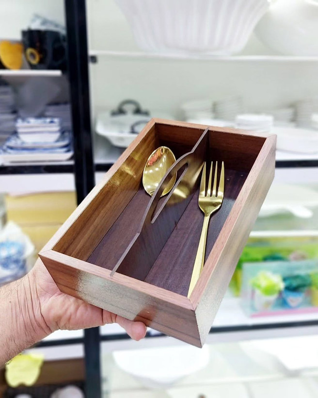 جا قاشقی چوبی دو طرفه برند ROMER ابعاد : 15*25 ، ارتفاع 5 سانت جنس چوب MDF درجه 1 به راحتی میتونید دو دست قاشق و دو دست چنگال رو در این کار قرار بدید مناسب استفاده : داخل کشو ، داخل کابینت و روی میز